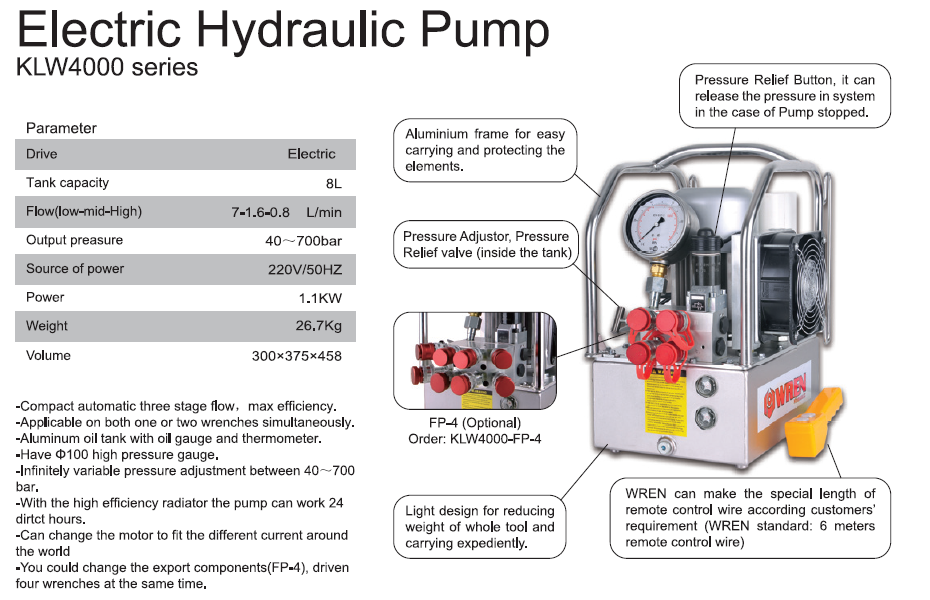 – Bơm Cờ lê thủy lực KLW4000( 8 lít) là sản phẩm của hãng Wren/China: