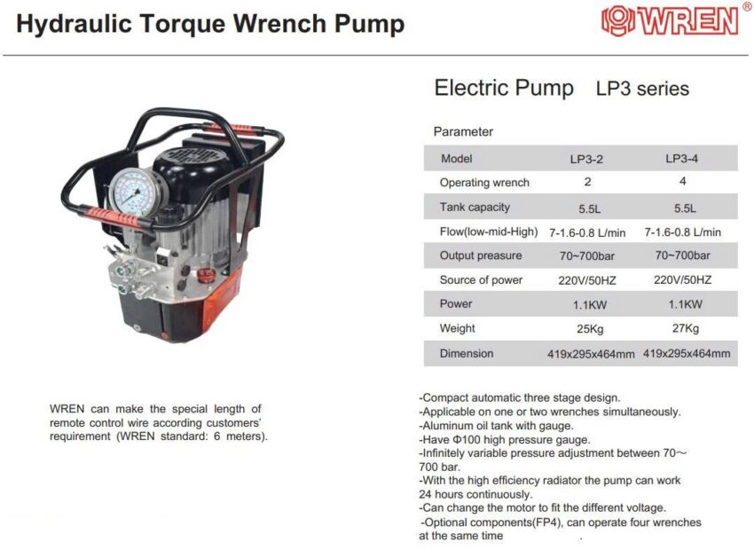 – Bơm điện Cờ lê thủy lực LP3-2 hoặc LP3-4( 5.5 lít) là sản phẩm của hãng Wren/China: