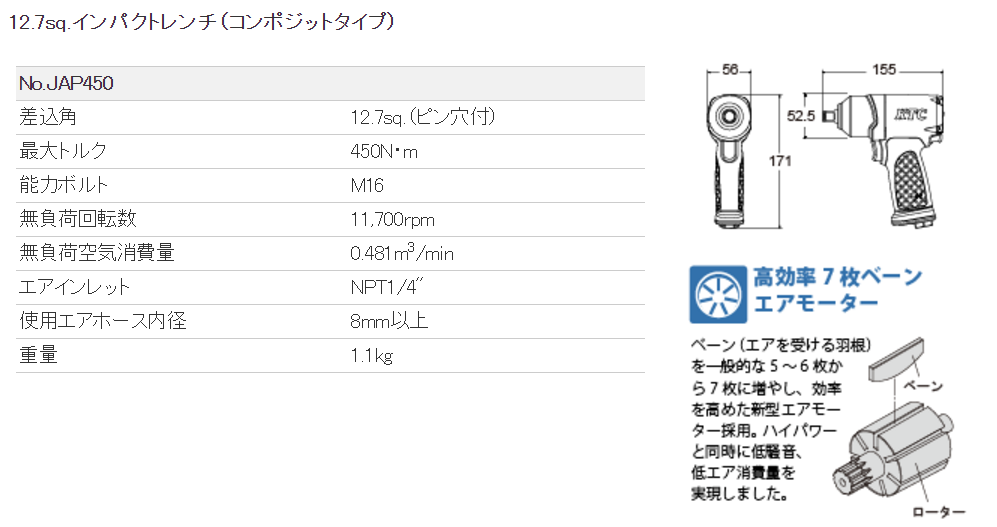 *Thông số kỹ thuật của súng siết bu lông khí nén JAP450 :