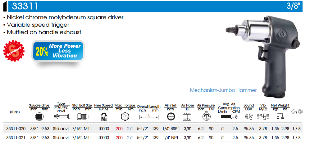 – Súng siết bu lông khí nén Kingtony 33311-020 3/8” lực siết Max.271 Nm được sản xuất bởi hãng Kingtony/Taiwan.