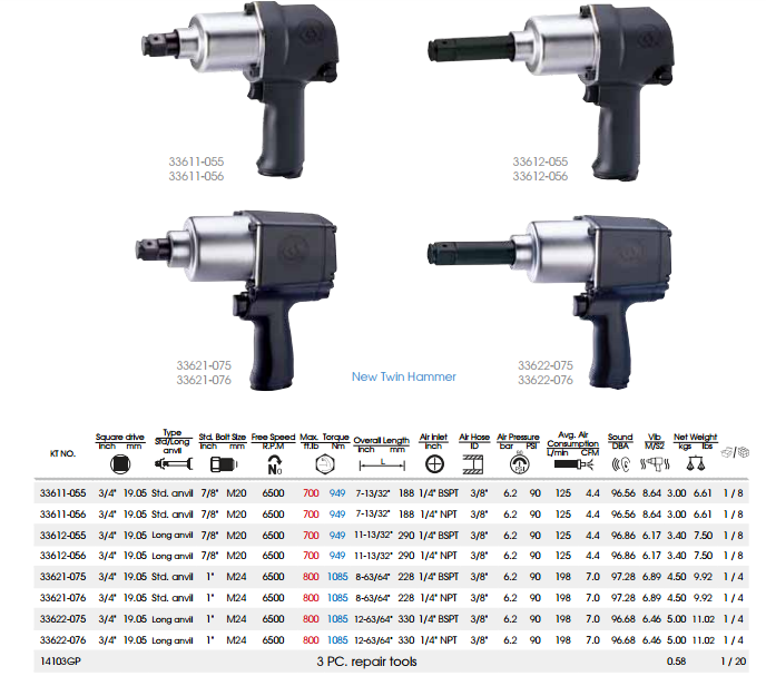 *Thông số kỹ thuật của súng siết bu lông khí nén 33611-055 như sau :