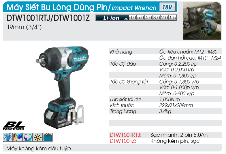 – Súng siết bu lông pin DTW1001RTJ(18V) lực siết Max.1.050 Nm được sản xuất bởi hãng Makita/Japan, đi kèm sạc và 2 cục Pin 4.0 Ah .