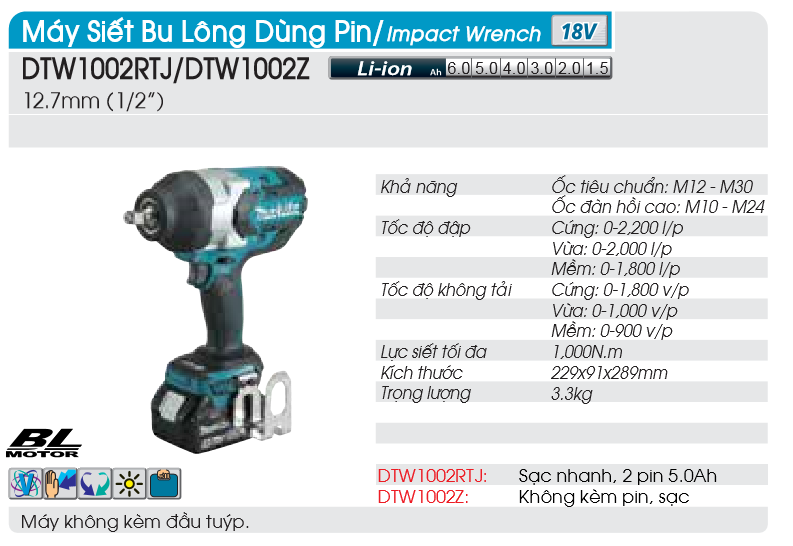 – Súng siết bu lông pin DTW1002RTJ(18V) lực siết Max.1.000 Nm được sản xuất bởi hãng Makita/Japan, đi kèm sạc và 2 cục Pin 4.0 Ah .