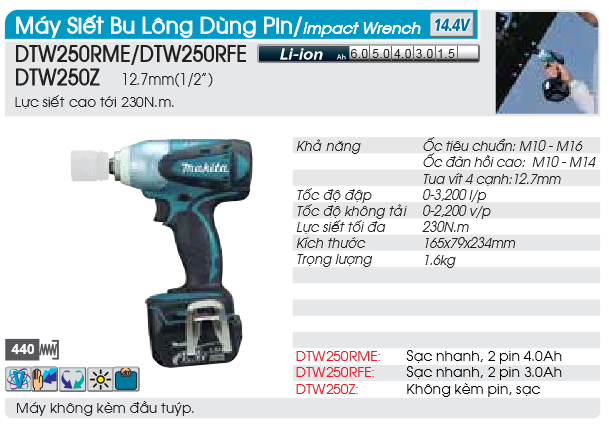 – Súng siết bu lông pin DTW250RME(14.4V) lực siết Max.230 Nm được sản xuất bởi hãngMakita/Japan, đi kèm sạc và 2 cục Pin 4.0 Ah .