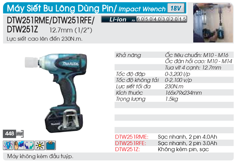 – Súng siết bu lông pin DTW251RME(18V) lực siết Max.230 Nm được sản xuất bởi hãngMakita/Japan, đi kèm sạc và 2 cục Pin 4.0 Ah .