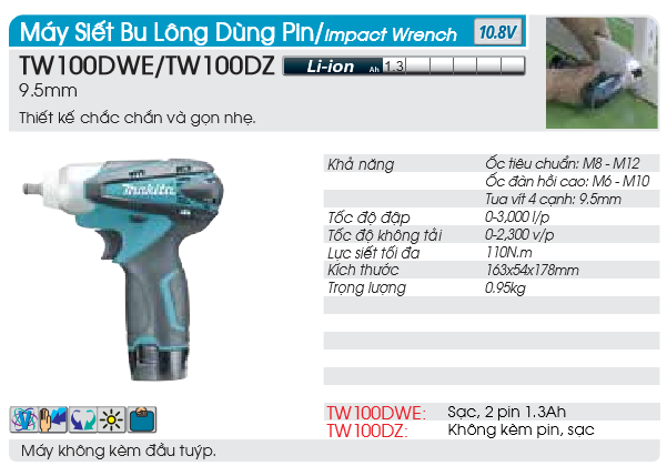 – Súng siết bu lông pin TW100DWE(10.8V) lực siết Max.110 Nm được sản xuất bởi hãng Makita/Japan, đi kèm sạc và 2 cục Pin 1.3 Ah .